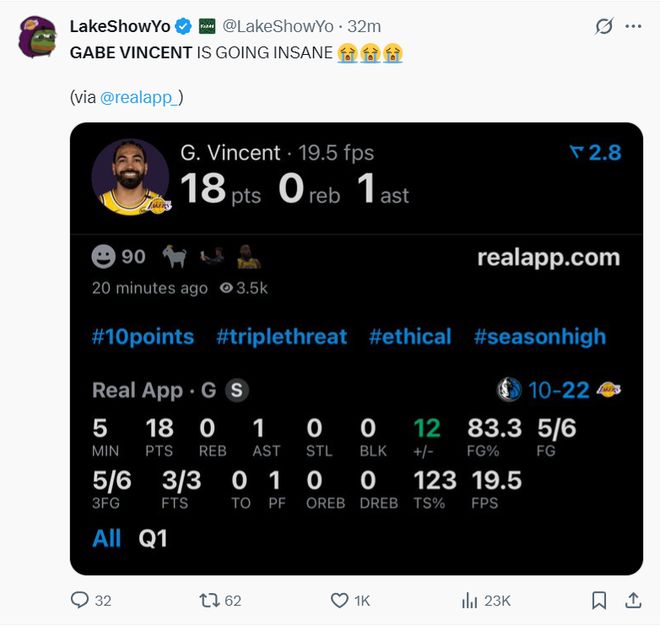 开场文森特带领湖人打出了22-10的小高潮,湖媒写道:文森特这太疯狂了(爆哭表情)。