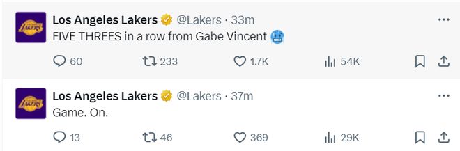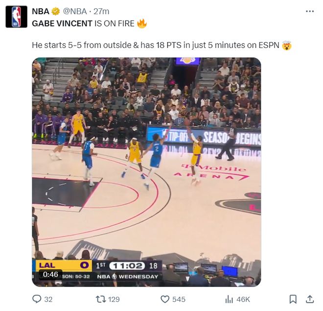 湖人官方写道,文森特刚刚连续命中了五个三分球。